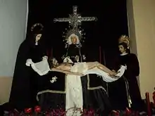 A la Santa Vera Cruz y al Santo Entierro le acompañan también María Magdalena de la Cofradía del Santísimo Cristo del Perdón y Santas Verónica y María Magdalena y Nuestra Señora de los Dolores de la Cofradía de Nuestra Señora Virgen de los Dolores. Antiguamente lo hacía también San Juan de la Venerable y Antigua Cofradía de Penitencia del Stmo. Cristo de la Buena Muerte, María Stma. de la Amargura y San Juan Evangelista