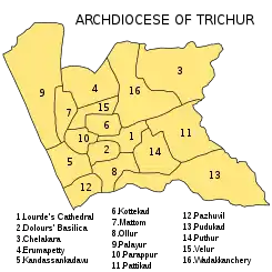 El territorio se extiende a 2000 km² y está subdividido en 227 parroquias agrupadas en 16 foranes: Lourdes Cathedral, Dolours' Basilica, Chelakara, Erumapetty, Kandassankadavu, Kottekad, Mattom, Ollur, Palayur, Parappur, Pattikad, Pazhuvil, Pudukad, Puthur, Velur y Wadakkanchery.