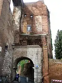 El arco está ubicado en la colina de Celio, en la esquina norte del sitio de la Castra Peregrina.[2] Se extiende por la moderna Via di S. Paolo della Croce, siguiendo la línea del antiguo Clivus Scauri. Su ubicación indica que fue una reconstrucción de una de las puertas de las Murallas servianas, aunque no está del todo confirmado, pudiendo haber sido esta o la porta Querquetulana o la Puerta Celimontana. Aunque este último se considera el original más probable, no hay indicios de que se haya salido de la ciudad por la Celimontana.[1]