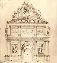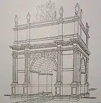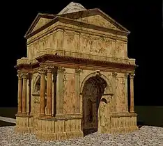 La vía Flaminia pasaba por debajo del edificio de norte a sur y la vía Veientana de oeste a este. El arquitecto Giuliano da Sangallo, uno de los más grandes artistas del Renacimiento, es el responsable de la primera reconstrucción gráfica del aspecto original del monumento.[7]