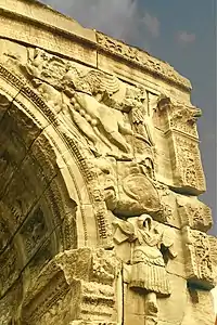 Las deidades patronas de la ciudad, Apolo y Minerva, aparecen en los dos frontones delanteros, en bigas tiradas por grifos y esfinges. Otras interpretaciones toman las figuras de las bigas como representantes de Lucio Vero y la diosa Roma, respectivamente.