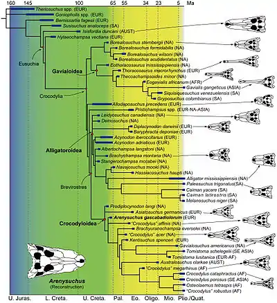Con la excepción de Prodiplocynodon, los crocodilianos norteamericanos del Cretácico Tardío eran mayormente aligatoroides y gavialoides. En lo que es conocido como vicarianza, no ocurrió una migración entre Europa y Norteamérica, separando ambas faunas de crocodilianos. No sería hasta el Paleoceno que los crocodiloides se diversificarían en parientes más avanzados de Arenysuchus.[1]