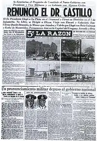 El golpe militar que depuso a Castillo tuvo lugar el 4 de junio de 1943. Se considera el final de la Década Infame y el punto de partida de la Revolución del 43. Arturo Rawson asumió el poder como presidente de facto. La naturaleza del golpe fue confusa durante sus primeros días: los funcionarios de la embajada alemana quemaron su documentación por temor a un golpe pro-Aliado, mientras que la embajada de Estados Unidos lo consideró un golpe pro-Eje.[23][24]
