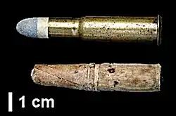 Arriba, un cartucho metálico para un Fusil Gras Modelo 1874, y abajo, un cartucho de papel para un Fusil Chassepot. El cartucho metálico protege la pólvora de la humedad, reduce la cantidad de humo y residuos que deja la combustión de la pólvora y el papel e impide que la ceniza afecte la vista del soldado y trabe el mecanismo del fusil.[7]:77