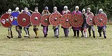 El escudo era el medio de defensa más común. Las sagas mencionan específicamente la madera de tilo para la construcción del escudo, aunque los hallazgos de las tumbas muestran principalmente otras maderas, como el abeto , el aliso y el álamo . Estas maderas no son muy densas y son livianas en la mano. Tampoco están dispuestos a dividirse, a diferencia del roble. Además, las fibras de la madera se unen alrededor de las cuchillas para evitar que la cuchilla corte más profundo a menos que se aplique mucha más presión. Junto con la madera más resistente, los vikingos a menudo reforzaban sus escudos con cuero o, ocasionalmente, hierro alrededor del borde.[4] Los escudos redondos parecen haber variado en tamaño desde alrededor de 45-120 centímetros (18-47 pulgadas) de diámetro, pero 75-90 centímetros (30-35 pulgadas) es con mucho el más común.