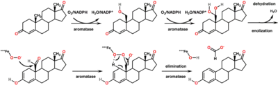 Los esteroides están compuestos por cuatro anillos fusionados (marcados A, B, C, y D en la figura de abajo); a esta estructura de cuatro anillos se le llama ciclopentanoperhidrofenantreno. La aromatasa transforma el anillo A de los esteroides a un estado aromático (de ahí su nombre) a través de la oxidación y posterior eliminación de un grupo metil.