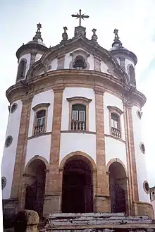 Las torres circulares o semicirculares (a veces poligonales), posicionadas de manera retrasada en relación a la fachada, hicieron escuela en Minas Gerais, siendo encontradas por ejemplo en la Matriz de Barão de Cocais (antes de 1785) y en las Iglesias de la Orden Tercera de Carmo de San Juan del Rey (tras 1787) y de Mariana (tras 1783).[36] Torres circulares están ausentes de la arquitectura del litoral brasileño y de la metrópoli, con la salvedad de la demolida São Pedro de los Clérigos del Río.[30]