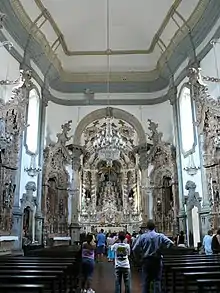 Los interiores de las iglesias coloniales deben ser vistos no sólo en términos arquitectónicos pero también decorativos, pues los ambientes internos eran muchas veces definidos por la armoniosa interacción entre talla dorada, pintura y azulejería, típica del arte portugués.[24]