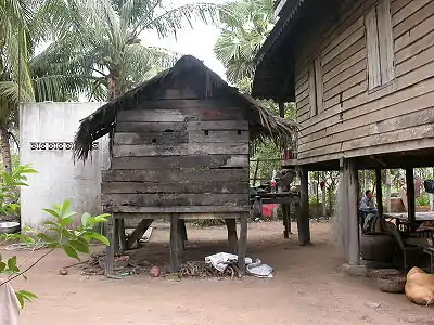 El núcleo familiar, en zonas rurales de Camboya, por lo general vive en una casa rectangular que puede variar en tamaño de cuatro por seis metros y seis por diez metros. Está construido con un marco de madera con techo de paja a dos aguas y paredes de bambú tejido. Las casas Jemer normalmente se levantan en zancos hasta tres metros para la protección contra las inundaciones anuales. Dos escaleras de madera facilitan el acceso a la casa. El techo de paja y las paredes de la casa protegen el interior de la lluvia. Normalmente una casa contiene tres habitaciones separadas por tabiques de tejido de bambú. La sala de estar sirve como una sala de estar usado para recibir a los visitantes, en la habitación de al lado está el dormitorio de los padres, y el tercero es para las hijas solteras. Los Hijos duermen en cualquier parte que puedan encontrar. Los familiares y vecinos trabajan juntos para construir la casa, y una ceremonia de la casa de sensibilización se lleva a cabo después de su terminación. Las casas de las personas más pobres solo pueden contener una sola habitación grande. La comida se prepara en una cocina independiente situada cerca de la casa pero por lo general detrás de ella. WC consisten en fosas simples en el terreno, que se encuentran lejos de la casa, que están cubiertos hasta cuando se llena. Cualquier animal se mantiene por debajo de la casa.