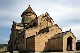 Posteriormente, la Dinastía Bagrationi, entre los siglos IX y XI impulsó un gran renacimiento artístico, construyendo monasterios y desarrollando la forma basilical hacia la planta de iglesia de cruz alargada con tambor y cúpula apuntada elevada sobre el crucero como en la Catedral de Svetitsjoveli.