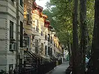 El carácter de los grandes distritos residenciales de Nueva York a menudo se define por las elegantes casas en hilera, casas adosadas y viviendas de piedra rojiza que se construyeron durante un período de rápida expansión desde 1870 hasta 1930.[5] En contraste, Nueva York también tiene vecindarios que están menos densamente poblados y cuentan con viviendas independientes. En los distritos exteriores, las grandes casas unifamiliares son comunes en varios estilos arquitectónicos, como neotudor y victoriano.[6][7][8] Las casas divididas para dos familias también están ampliamente disponibles en los distritos exteriores, por ejemplo, en el área de Flushing.