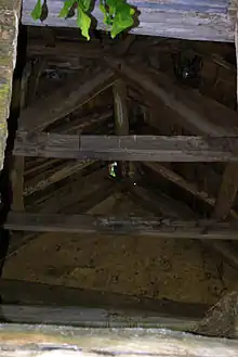 El techado es normalmente de dos aguas. La armadura tradicional es de madera de especies comunes en la región, como el chopo, abedul o roble. Las vigas situadas sobre los muros sobre las que se apoya el resto del armamento reciben el nombre de durmientes o estribos. Sobre ambos extremos y entre medias se sitúan los tijerones, unas estructuras triangulares compuestos de dos cerchas formando un ángulo, sujetas por debajo por un tirante que se extiende entre las durmientes. Sobre los vértices de los tijerones se apoya la cumbre o filera. Los «cantiaos» conectan la cumbre con las durmientes y sobre ellos se disponían los cangos, atados con varas de mimbre o las llatas o ripias, dependiendo de si la cubierta era vegetal o no.[n. 2] También se encuentran techados de tres o cuatro aguas. Las cubiertas a dos aguas aparecen a veces con un testero resaltado y escalonado que continúa el muro de carga.[3]