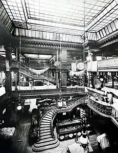 La iluminación de gas y la incipiente iluminación eléctrica suponían serios riesgos de incendio para los primeros grandes almacenes. Por ello, los arquitectos de las nuevas tiendas usaban grandes tragaluces de vidrio siempre que fuera posible para inundar las tiendas con luz natural, y diseñaban los balcones que rodeaban los patios centrales de manera que proporcionaran la máxima luz posible a cada sección. La tienda de Galeries Lafayette en el Boulevard Haussmann, completada en 1912, combinaba los tragaluces sobre los patios con balcones ondulados, que daban al interior el rico efecto rococó de un palacio barroco. Antes de que la tienda fuera ampliada y modernizada, tenía varios grandes salones verticales iluminados gracias a cúpulas de vidrio con una rica decoración.[14]