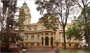 De un eclecticismo más ornamentado es el Pazo Municipal de Puerto Alegre, proyectado por Giovanni Colfosco, un italiano, e iniciado en 1898. Sería uno de los primeros ejemplos arquitectónicos en exhibir la influencia del Positivismo, percibida en la compleja red de alegorías representadas en la escultura decorativa de la fachada. También sería uno de los primeros edificios públicos monumentales de la que se posteriormente vendría a ser llamada coma la "fase dorada" de la arquitectura portoalegrense.[1] Según Beatriz Thiesen,