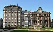 - Casa de Fernando Carreras. Ubicada en la calle del Arenal, también se le conoce como Edificio del Rectorado,[46] se trata de una edificación proyectada en el año 1863 por el arquitecto Manuel de Úceda. Fue la primera edificación indiana de la ciudad, el edificio de aspecto clasicista consta de tres plantas, con buhardillas bajo cubierta, añadidas después de la obra principal, y patio de luces interior. Inicialmente la construcción se trataba de un palacete residencial, aunque con el paso de los años el edificio ha tenido diversos usos, como sucursal del Banco de España, rectorado de la Universidad de Vigo o sede del Gobierno Militar.[60]