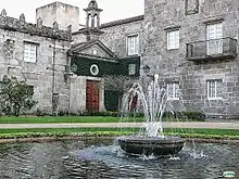 - Pazo de Montecelo.[48] Cercano a la avenida de García Barbón, en pleno casco urbano del municipio, también es conocido como Casa Durán, se trata de un pazo que data del año 1850 y que posteriormente fue rehabilitado por la familia Durán. El edificio construido en perpiaño granítico está catalogado como Bien de Interés Cultural, consta de dos alturas y en su lateral se encuentra una torre almenada, mientras que en la parte baja hay un corredor asoportado bajo arcos de medio punto, que dan lugar a una balconada en su parte superior, la cual cuenta con balaustradas de piedra.[49] La combinación de estos elementos constructivos hacen que el Pazo de Montecelo sea un ejemplo arquitectónico de combinación de estilo barroco y medieval.[50] Actualmente el pazo es sede de un bufete de abogados, siendo esta misma empresa la que recientemente contrató las últimas obras de remodelación del inmueble.
