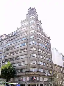- Salgueiro García Barbón. Data del año 1934, se encuentra situado en la Puerta del Sol y es obra de Romualdo de Madariaga. El edificio de estilo racionalista consta de cinco plantas, su estructura interior es de hormigón, mientras que sus muros exteriores son de granito. En sus fachadas destacan elementos propios del art decó ocasionalmente adornados con piezas de cerámica, como en sus pilastras, o en las formas redondeadas de estilo expresionista de su chaflán.[73]