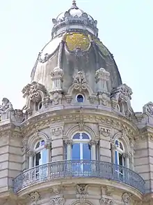 - Sede social del Real Club Celta de Vigo. Hasta el año 2015 fue sede del Círculo Cultural Mercantil e Industrial de Vigo, en la actualidad es la sede institucional del Real Club Celta de Vigo.[72] Los orígenes del edificio datan del año 1921, año en el que comenzaron las obras de rehabilitación de un antiguo inmueble a cargo del arquitecto Manuel Gómez Román para adaptarlo a las necesidades del Círculo Mercantil, posteriormente fue ampliado a cargo del propio Gómez Román en 1925. De estilo ecléctico con componentes clasicistas, en el que también destaca una galería que cubre el tramo central de la fachada, sus elementos decorativos más destacados se encuentran en los capiteles de las pilastras y en las ménsulas que sustentan la galería.[75] Posteriormente, tras la adquisición del edificio por parte del Real Club Celta, se realiza una reforma al inmueble conforme al proyecto del arquitecto Alfonso Penela, entre los cambios acometidos destaca el añadido de una gran cúpula acristalada en su parte superior.[76]