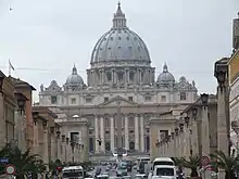 Otro genio del renacimiento, Miguel Ángel, completó la cúpula de la Basílica de San Pedro de Roma, proyecto iniciado por Bramante. Este tipo de cúpulas, inspiradas en la Roma imperial, se convertiría en un referente para numerosos templos posteriores. De hecho, la concepción renacentista de su grandiosa estructura,[28] queda embebida en la concepción barroca de la mayoría de sus elementos decorativos, quedando el edificio enmarcado por la espectacular columnata y el conjunto de esculturas ideado por Lorenzo Bernini. La basílica de San Pedro se enmarca dentro de la concepción barroca de la liturgia, en la que las imágenes y la exuberante ornamentación del templo pretenden potenciar un sentimiento de elevación en los fieles.