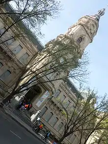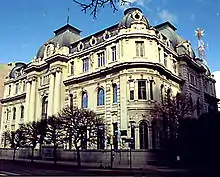 Exteriormente, conforme con los cánones académicos, presenta la clásica división tripartita de basamento, desarrollo y coronamiento. El desarrollo toma dimensiones predominantes, abarcando prácticamente la totalidad del edificio. Dentro de este mismo desarrollo se observa una división que separa el primero y segundo pisos del tercero que -tratado a la manera de ático- tiene cuatro esculturas de poderosos atlantes que semejan sostener el pesado entablamento. Finalmente un paño de mansarda con óculos y cupulines corona el edificio.