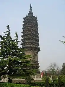 La Pagoda de Hierro del templo de Youguo en la ciudad de Kaifeng es un excelente ejemplo de la arquitectura de la era Tang. Originalmente construida en madera por el arquitecto Yu Hao, fue alcanzado por un rayo y quemada en 1044 durante el reinado de los Song del Norte. En 1049, la pagoda se reconstruyó tal como es hoy, a petición del emperador Song Renzong. Esta pagoda de forma octogonal se eleva a 5,.88 metros con un total de 13 niveles.[11] La torre está adornada con azulejos de ladrillo esculpidos que representan figuras danzantes, ministros solemnes y temas budistas (ver la galería más abajo).