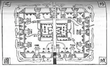 «Norma para los muros de la ciudad: para cada altura de 40 chi, el ancho de la pared en la base se incrementará en la mitad de la altura, el ancho de la parte superior de la pared se reducirá a la mitad de la altura. El ancho de la base debe ser el mismo que el ancho de la base de la pared. Para cada longitud de 7,5 chi, se han de aplicar dos postes permanentes y dos travesaños, reforzados con madera y fardos de paja». [6]