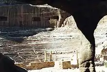 • Calle de las Fachadas (imagen),[58] un conglomerado de unos 40[59] habitáculos esculpidos en forma de prismas cuya función como tumbas o casas está todavía en debate. Su rasgo más exótico lo constituyen los frisos adornados con relieves en forma de almenas escalonadas, llamadas escalerillas de cuervo.[55]