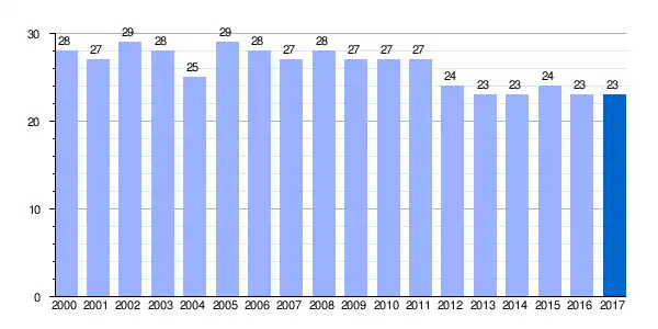 Gráfica de evolución demográfica de Arrízala[1] entre 2000 y 2017 |