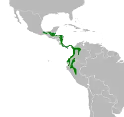 Desde el sur de México hasta el norte de Perú. En México habita desde el norte de Oaxaca (al sur de Tuxtepec), a través del sur de Veracruz, Tabasco y Chiapas. A través del norte de Guatemala llega hasta el Mar Caribe, y a lo largo de esa costa se distribuye hacia el sur. No se ha registrado en El Salvador. En Costa Rica y Panamá alcanza ambas costas; de ahí pasa a Sudamérica, donde se distribuye en las selvas de la vertiente pacífica de Colombia, Ecuador y el norte del Perú.