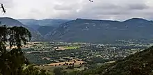 Arroyo de Valdivielso, al fondo de la imagen, a los pies del pico Alto Llano y el corto desfiladero de La Canaleja, que se interna en la sierra de la Tesla. A la derecha, la localidad vecina de Población de Valdivielso, del mismo municipio.