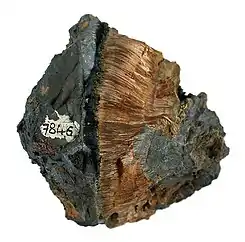 ![]() Arseniosiderita sobre romanechita, procedente de Romanèche-Thorens, La Chapelle-de-Guinchay, Francia | ||