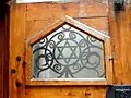 - Estrella de David. Reja de hierro con el escudo de armas de la Comunidad Judía de Praga, Sinagoga Maisel, Praga