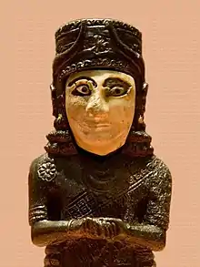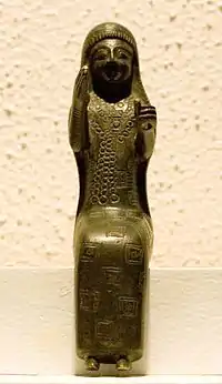 A la izquierda : Estatuilla del dios de Urartu de la guerra Teisheba. Fue descubierto en 1941 en las excavaciones de Karmir Blur en las ruinas de la fortaleza de Teishebaini, llamada así en honor a este dios. A la derecha: Estatuilla de la diosa Arubani, esposa del dios Haldi, comprada varias veces por coleccionistas privados de antigüedades antes de entrar en las colecciones del Museo de Historia Armenia en 1936. Es posible que esta estatuilla haya sido descubierta en las orillas del lago Van. |