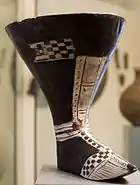 De izquierda a derecha:ritón de arcilla pintada en forma de bota. Descubierto durante las excavaciones en Karmir Blur. Conservado en el Museo de Historia de Armenia; ritón en forma de cuello de animal. Descubierto en el raión de Van. Conservado en el Museo Arqueológico de Estambul; Vaso ritual decorado con cabezas de toro. Descubierto durante las excavaciones de los enterramientos del periodo Urartu en el territorio de Armenia. Conservado en el Museo Erebuni.[17] |