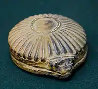 Ornamento femenino de plata (pectoral) con una representación del dios Haldi (en el trono) y su esposa, la diosa urartiana Arubani. El pectoral está guardado en un museo en Berlín.. | Tapa de caldera de plata con una figura que representa una granada. Mencionado como propiedad de Argishti I, Museo de Historia Armenia. |