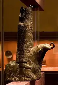 Figuras de bronce, partes del trono conservadas en San Petersburgo en el Museo del Hermitage, Rusia. Las figuras de bronce han conservado rastros de dorado. Los rostros de las bestias salvajes y la deidad de la derecha fueron hechos de piedra, probablemente con incrustaciones de piedras preciosas, por lo que todos los rostros han sido rotos y no se han conservado.. | ||||