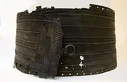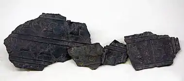 Restos de un cinturón de metal de Urartu, descubierto durante las excavaciones en la ciudad de [Erebuni] en la colina de Arin Berd. Están guardados en el Museo Erebuni en Ereván. | Cinturón de bronce de Urartu, descubierto en la región de Van (Turquía). Conservado en el Museo de las Civilizaciones de Anatolia en Ankara. |