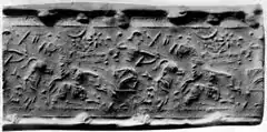 Los sellos cilíndricos representan tradicionalmente motivos cósmicos o religiosos, y con menos frecuencia escenas de caza. En las muestras mostradas hay representaciones de la luna, las estrellas, arqueros apuntando y, a veces, del árbol de la vida. |