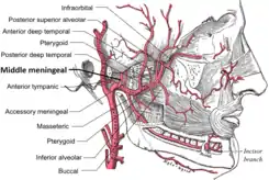 La arteria meníngea media es una arteria que se origina como rama colateral ascendente de la arteria maxilar.[1]