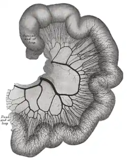 ![]() Bucle de intestino delgado que muestra la distribución de las arterias intestinales. | ||
