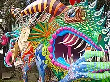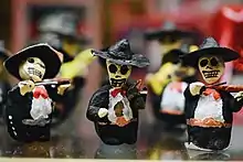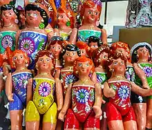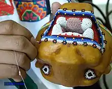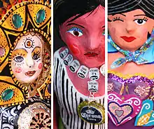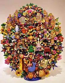 Las artesanías mexicanas y el arte folklórico es una compleja colección de objetos hechos con diversos materiales, modelados con fines utilitarios, decorativos o de otro tipo, como tapices, jarrones y juguetes creados para celebraciones, festividades y ritos religiosos.[3] Estos objetos son llamados artesanías en el español mexicano. Este término fue inventado en español durante el siglo XX, para distinguir la mercancía hecha mediante métodos tradicionales de aquellos fabricados industrialmente o en una línea de ensamblaje.[4] La artesanía mexicana tiene sus cimientos en las artes de varias culturas prehispánicas dentro del país, pero 500 años de influencia asiática y europea la ha transformado en una mezcla de las dos y exclusiva de México. La mayoría de la artesanía producida en este país muestra influencias Europeas y nativas en la forma de elaborarse, el diseño o ambas.[3]
