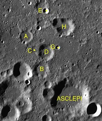 Por convención estos elementos son identificados en los mapas lunares poniendo la letra en el lado del punto medio del cráter que está más cerca de Asclepi.