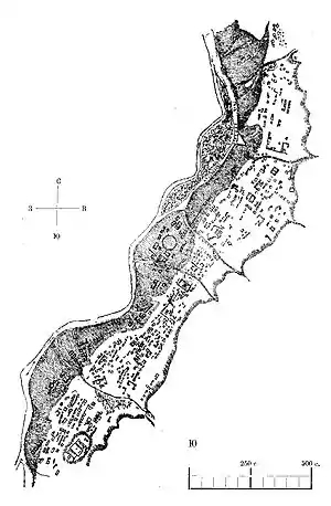 - La ciudad. El territorio de la antigua ciudad en sí comienza desde el haz de Hassan y el Templo del Centro ubicado en su borde. Sus edificios están situados a lo largo de tres calles estrechas y bien trazadas, de unos 3 metros de ancho y sin signos de mejora: un pavimento, canalones y similares, por lo que los arqueólogos les dieron nombres convencionales. La calle Tsentralnaya es bastante recta, comenzando desde la Podrovanaya y pasando por todo el asentamiento hasta el río y el Anillo de Piedra ubicado en su orilla. La calle Podgornaya, se bifurca de Tsentralnaya y, después de 220 metros, formando un bucle, va más al noreste a lo largo de la base de la cordillera Uzhum. La calle Naberezhnaya se extiende a lo largo de un acantilado hasta el río durante más de 500 metros, y finalmente se fusiona con la calle Central. Dentro de la fortificación se encuentra el bien conservado Templo del Sur.