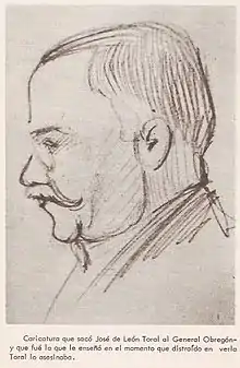 José de León Toral fue un católico mexicano nacido el 23 de diciembre de 1900 en Matehuala, San Luis Potosí. Fue miembro de la Asociación Católica de la Juventud Mexicana y de la Liga Nacional para la Defensa de las Libertades Religiosas, dentro de estos grupos conoció a muchas personas afectadas por la ley Calles. Algunos de los integrantes —entre ellos Roberto y Miguel Agustín Pro— promovían la resistencia pacífica mediante la administración de sacramentos en secreto, mientras otros miembros pugnaban por la revuelta violenta, entre ellos Luis Seguirá Vilchis, quién planeó varios atentados en contra de Obregón.[2][9][27][28]