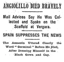 A principios de agosto de 1897 Angiolillo se encontraba en Guipúzcoa y el día 8 al mediodía le disparó tres tiros de revólver al presidente del gobierno Antonio Cánovas del Castillo cuando leía los periódicos en un banco en el balneario de Santa Águeda, en el que pasaba unos días de descanso. El asesino fue detenido y juzgado inmediatamente. Durante el juicio justificó su crimen como una represalia por las torturas a las que habían sido sometidos los sospechosos por el atentado de la procesión del Corpus de Barcelona en el castillo de Montjuic a donde habían sido conducidos, y de las que hacía responsable al presidente del gobierno. También declaró su solidaridad con los que vivían en la miseria, su rechazo a la injusticia social y su amor al anarquismo. Dijo también que había actuado solo, aunque existen dudas de que esto fuera verdad porque había comentado sus planes con varias personas, a pesar de que también lo negó durante el juicio. Fue condenado a muerte y la sentencia se cumplió mediante garrote vil el 19 de agosto de 1897, sólo once días después de haber cometido el asesinato.[4] La ejecución la llevó a cabo el burgalés Gregorio Mayoral Sendino.