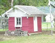 La Garfield Tea House, construida por los ciudadanos de Long Branch, Nueva Jersey, con los durmientes ferroviarios que habían sido tendidos específicamente para darle acceso ferroviario a Garfield a su pueblo aún se mantiene en pie.[87]