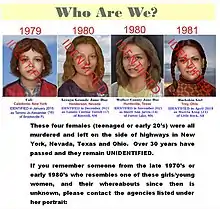 - Matt Guillermo (6 de octubre de 2015). «Henderson slaying victim still unidentified 35 years later». KVVU-TV (en inglés). Archivado desde el original el 14 de abril de 2016. Consultado el 21 de julio de 2022.