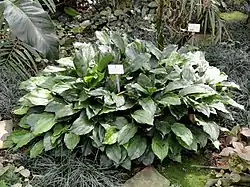 Tiene rizomas subcilíndricos, de 3 - 5 mm de espesor. Las hojas son solitarias, separadas entre sí; con pecíolo de 5-17 cm, más bien delgado; la lámina de la hoja generalmente amarillenta manchada de blanco, ovado-elípticas a elíptico-lanceoladas, de 8,5 a 14 x 2,8 a 6,5 cm. Escapo de 1 a 4 cm, brácteas de 4-6, blancas, manchadas de púrpura. La flor es solitaria. Perianto campanulado, con tubo de color púrpura-negro el haz, el envés púrpura.[1]