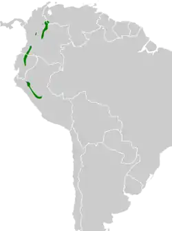 Se distribuye de forma disjunta a lo largo de los Andes, desde el oeste de Venezuela, por el norte y oeste de Colombia, Ecuador, hasta el norte y centro de Perú.[5]