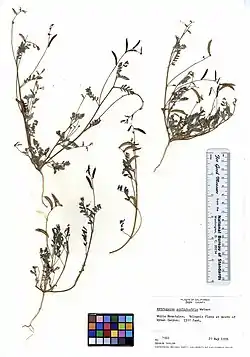 Es una leguminosa caducifolia que tiene un tallo rojizo y peludo que no alcanza más de 30 centímetros de largo por el suelo o ligeramente en posición vertical. Las hojas son pequeñas y se componen de varios pares de pequeños folíolos oblongos, cada uno con menos de un centímetro de largo y con la punta dentada. La inflorescencia contiene flores de color rosado o blanco. El fruto es ligeramente curvo, en forma de vaina leguminosa estrecha de 1 a 3 centímetros de larga. La vaina es de paredes delgadas, recubierta de pelos blancos como el resto de la planta.